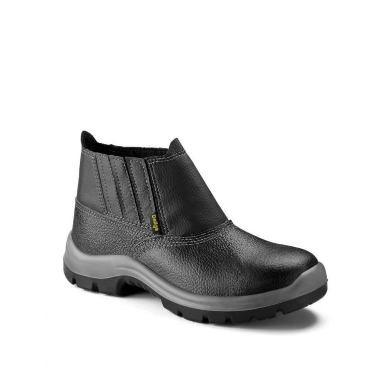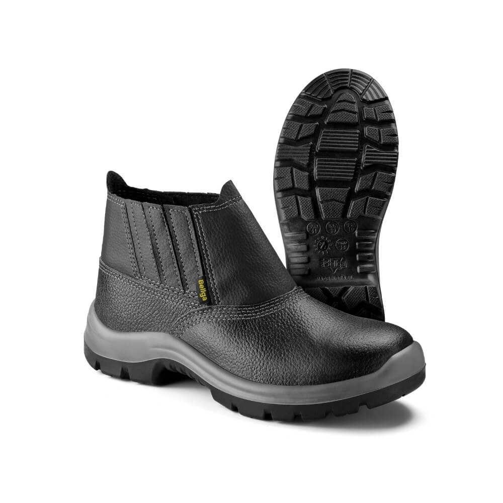 Calçado ocupacional para uso profissional, tipo botina, com cabedal confeccionado em couro vaqueta hidrofugada, fechamento em elástico, com biqueira plástica estrutural (PP), palmilha de montagem em material não tecido, forro em material não tecido na gáspea e no avesso, forro em material tecido nas laterais, solado à base de PU (poliuretano) bidensidade injetado direto no cabedal com absorção de energia na área do salto e resistente ao óleo combustível.